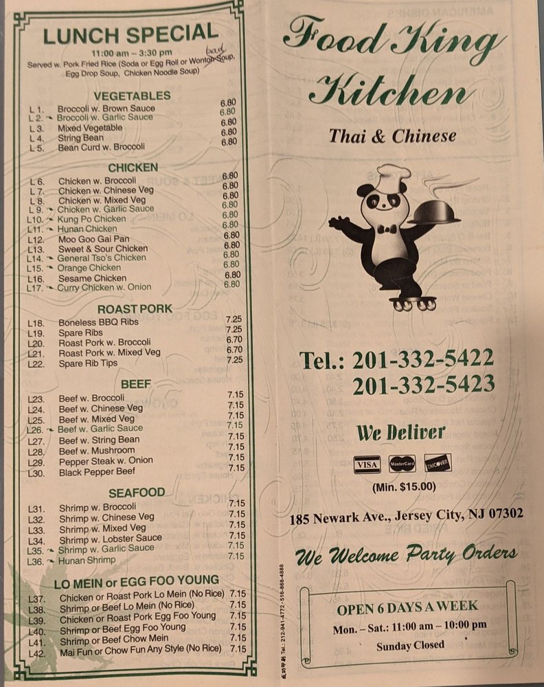 Food King Kitchen is a Chinese restaurant located in Jersey City, offering a variety of delicious dishes with many vegetarian options. Customers rave about the flavorful Black Pepper Chicken, Shrimp Lo Mein, white rice, and a variety of tasty dishes like kung po shrimp, hot and sour soup, sesame chicken, orange chicken, and wings. The friendly service adds to the overall dining experience. Whether you're looking for a quick takeout or a sit-down meal with friends and family, Food King Kitchen has got you covered. Located at 185 Newark Ave, Jersey City, this restaurant accepts credit cards, Android Pay, and offers delivery, takeout, reservations, and Wi-Fi. Don't miss out on the mouthwatering Chinese cuisine at Food King Kitchen!